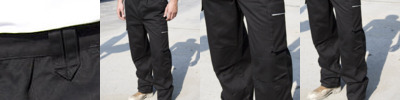 Front zip with rivet fastening. Knee pad pockets. 2 side pockets. Left thigh phone pocket and zip pocket. Cargo multi-use tool pocket. Elasticised waistband. Rear pockets. Belt loops. Reinforced seams with bar tacked pockets and stress points. Triple stitched seams. Decorative reflective stripe. Strengthened contrast knee fabric. Tricot waistband for comfort feel inner. Comfort fit. Highly durable fabric. Expansion waistband allows for adjustable fit and draught protection. Highly technical. Fantastic price point. Black contrast panels and red stitch detailing. 2 trouser turn-up for lengthening if required. Unisex fit. Windproof.