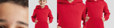 Single jersey back neck tape. Double fabric hood without drawcord, in-line with European childrenswear legislation. Front pouch pocket. Waist and cuff in cotton/elastane rib.