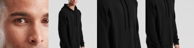 Double fabric hood. Self-coloured flat draw cord. Single jersey back neck tape. Covered zip for enhanced printability. Two front pouch pockets. Waist and cuff in cotton/elastane rib.