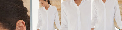 Seamless twin needle 1/2" collar. Taped neck and shoulders. Near cap sleeves for comfort. Side seam construction with stylish tapered fit. Twin needle sleeve and bottom hems.